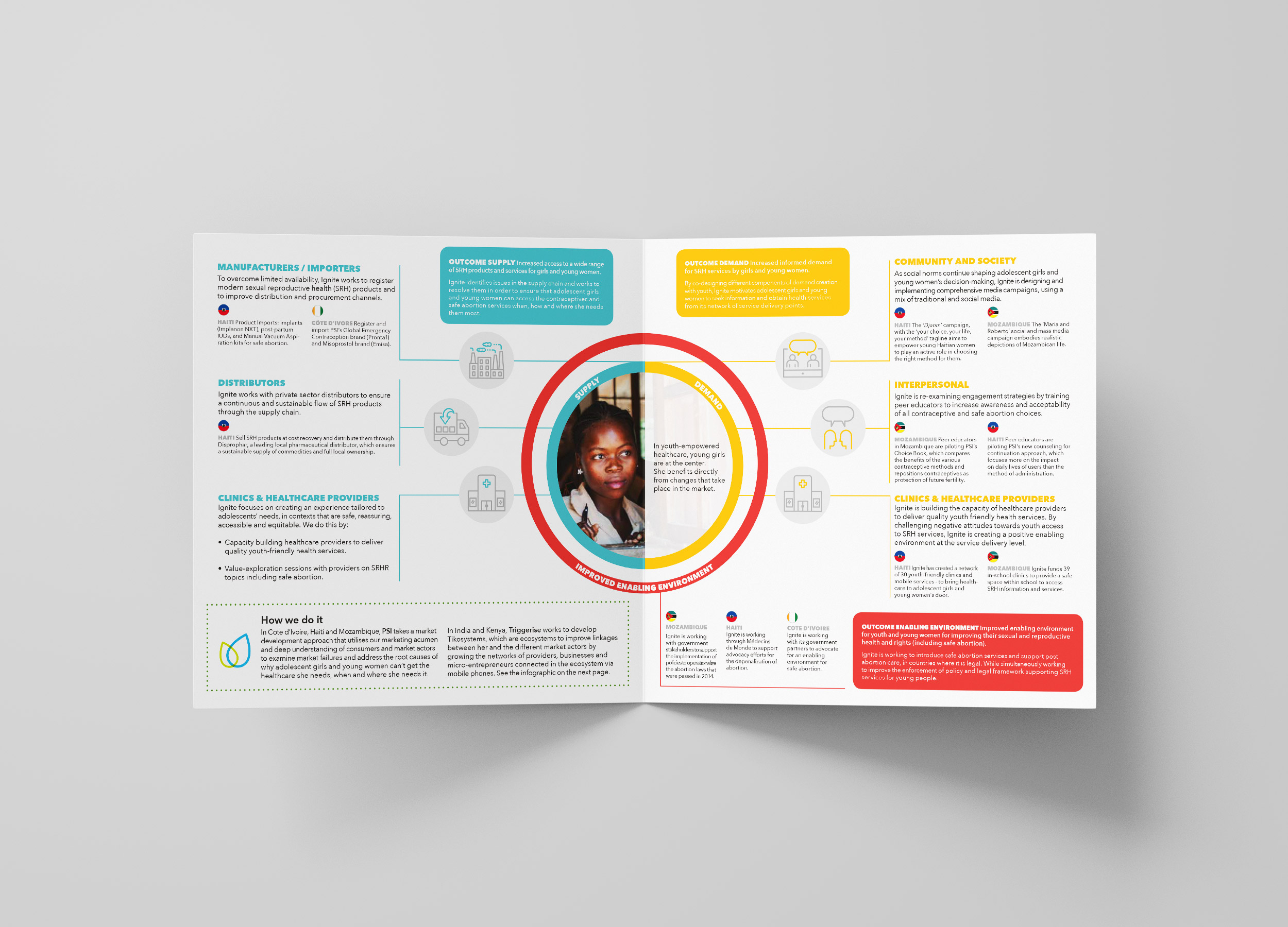 I had the opportunity to design the identity and print collateral for Ignite. This initiative, spearheaded by PSI and funded by the Dutch Ministry of Foreign Affairs, drives transformative change in the health market, ensuring easy access to contraception, post-abortion care, and legal safe abortion services for young people in Côte d’Ivoire, Haiti, India, Kenya, and Mozambique.